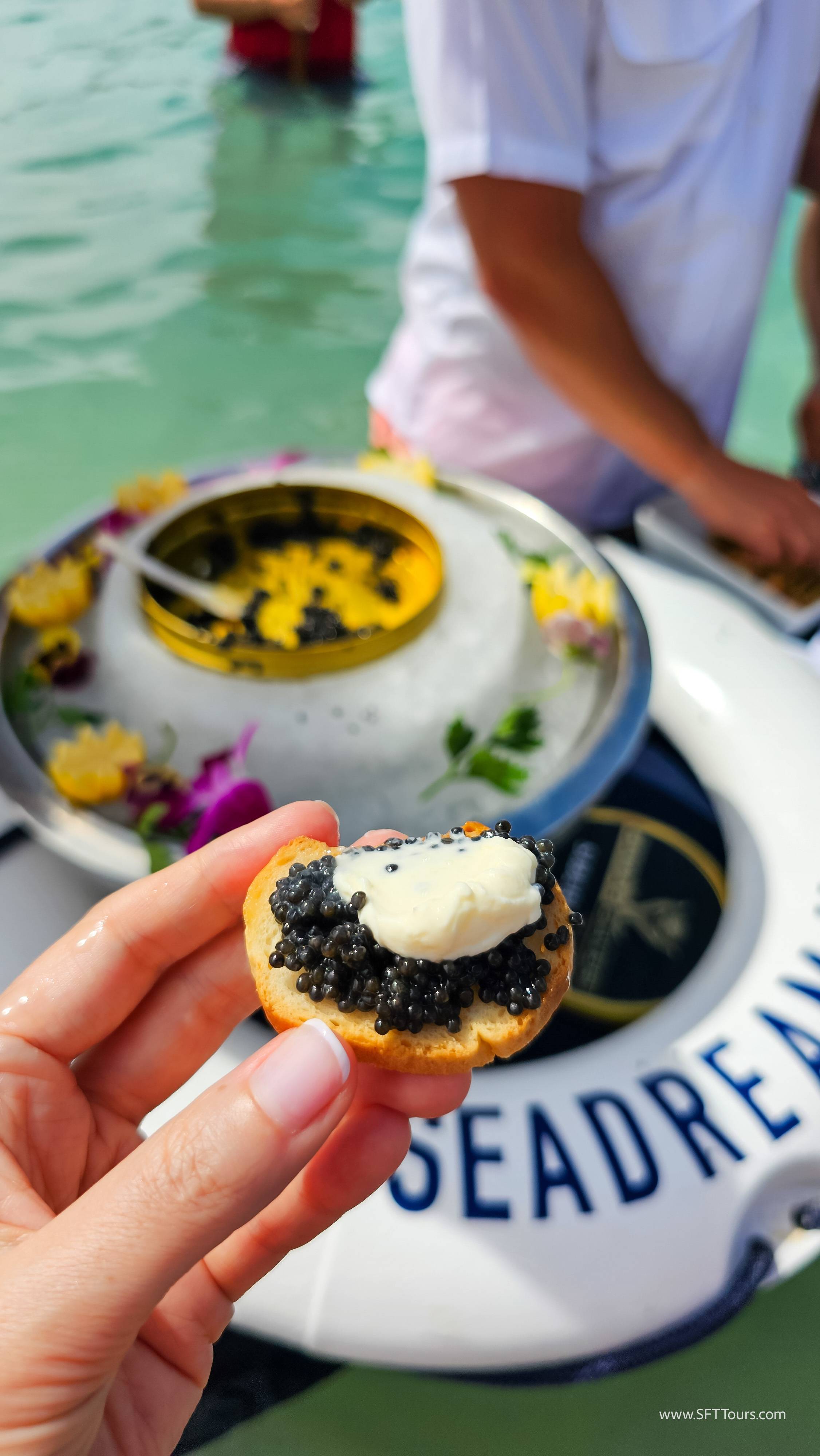 Nothing says indulgence like enjoying morsels of premium caviar enjoyed in your swim suit, at the beach.