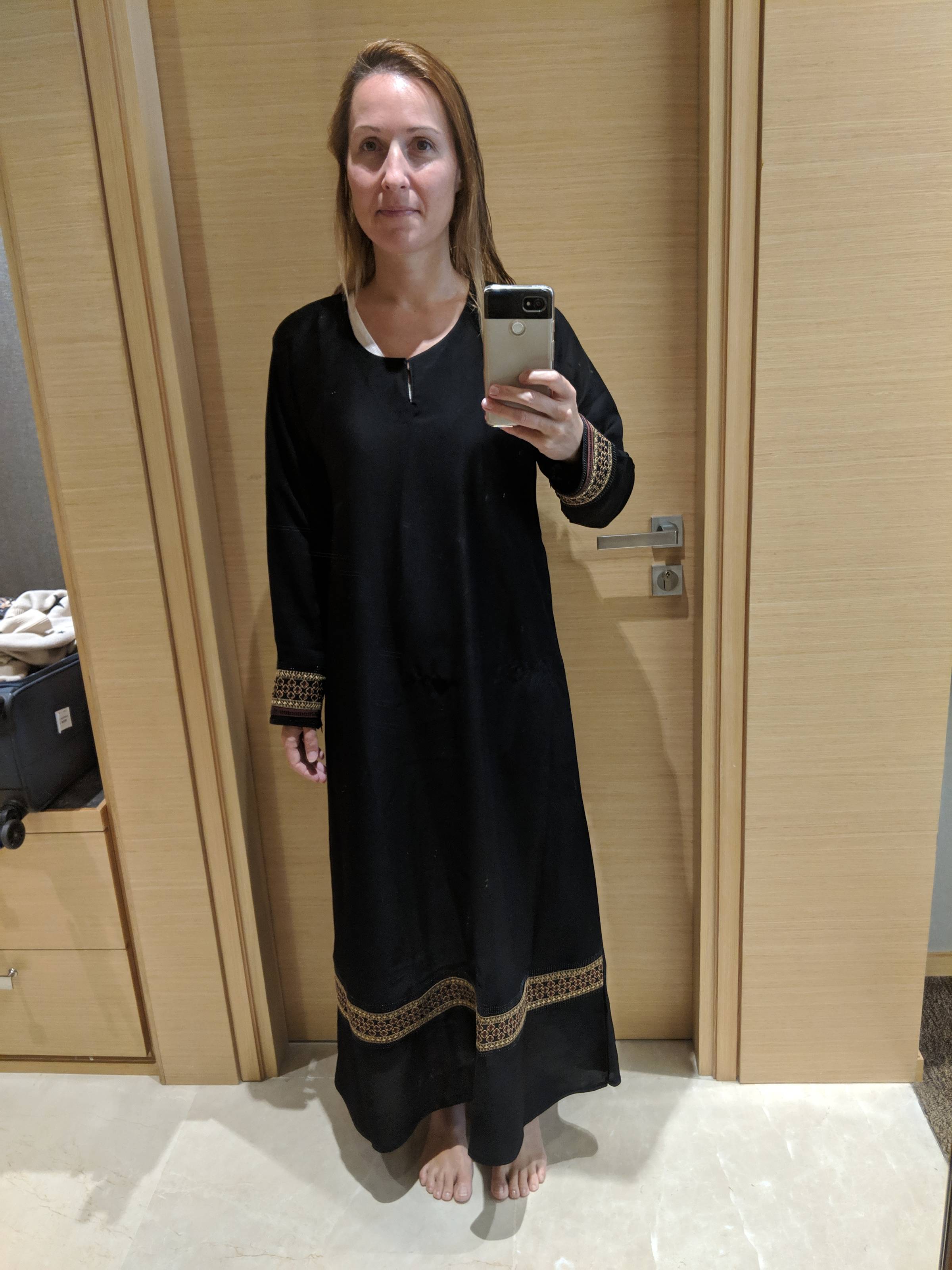 Putting on an abaya in Riyadh, Saudi Arabia, when it was still a requirement