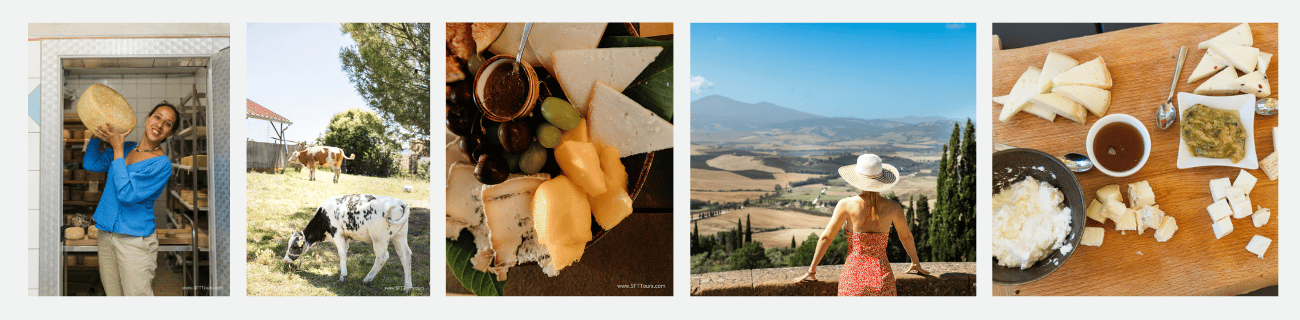 ๐ง Cheese: We will learn how pecorino cheese is made, met the goats who produce it and savor it with the most incredible views of the World Heritage listed Val d'Orcia landscapes at a local farm.